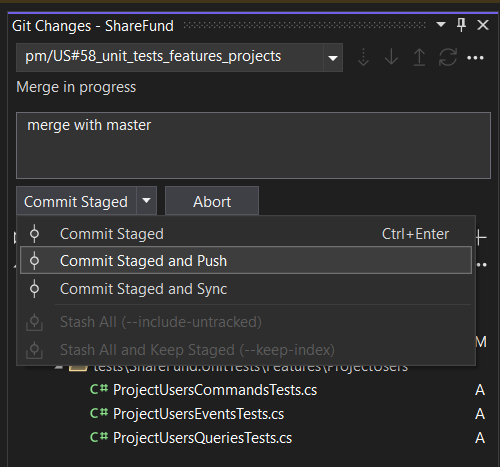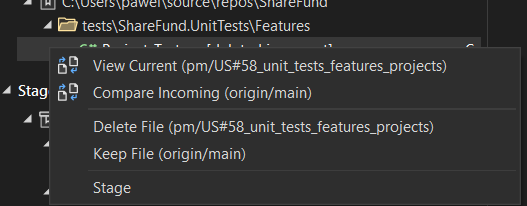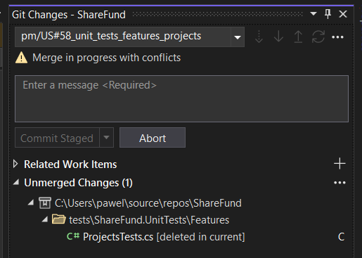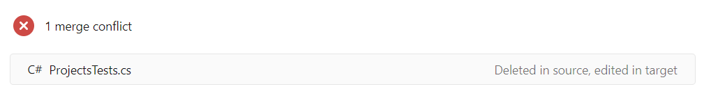 Please note that this conflict was about that in one branch the file was edited and in second it was deleted. The source branch is correct - the file should be deleted so we will delete the file. - Commit staged and push